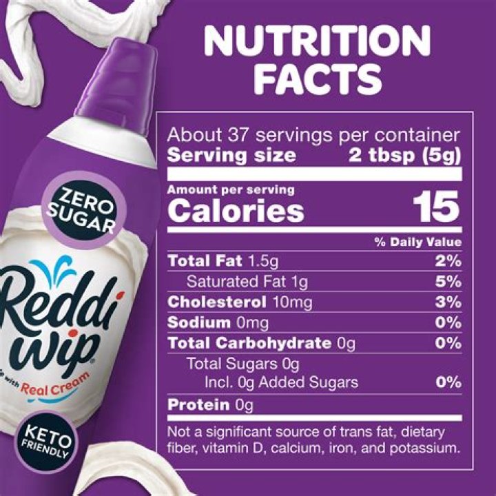 Reddi-wip Zero Sugar is a creamy, delicious whipped topping made with real cream, with 0 grams of sugar, 0 carbs, and 15 calories per serving (not a low-calorie food). It contains no artificial flavors and is gluten free and keto-friendly.