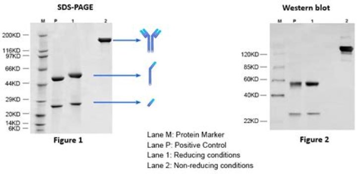 SDS-PAGE is one of the simplest, least expensive, and most commonly used techniques to analyze antibodies for purity. Reduced samples of the IgG class of antibodies give rise to glycosylated heavy chains of approximately 50 kDa and light chains of approximately 25 kDa on SDS-PAGE.