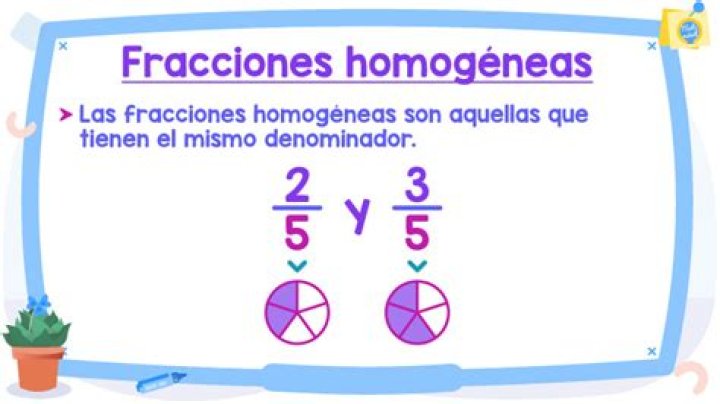Cuando dos o más fracciones tienen el mismo denominador se dicen homogéneas. … Una vez entendido esto es muy fácil sumar fracciones que tengan el mismo denominador, observa como se realiza la suma .