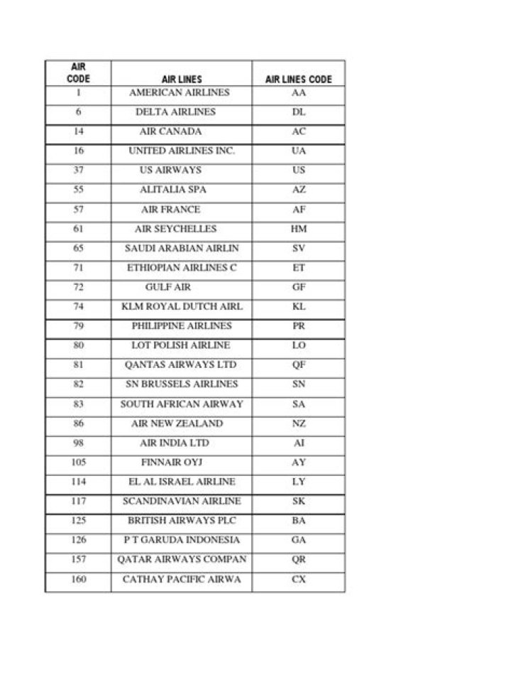 U.S. AIRLINES CODESAIRLINE NAME Alaska Airlines Aloha Air America West Airlines American Airlines Air One Continental Airlines Delta Air Lines Hawaiian AirlinesCODE AS AQ HP AA AP CO DL HACODE YX NW WN FF TW UA US FL