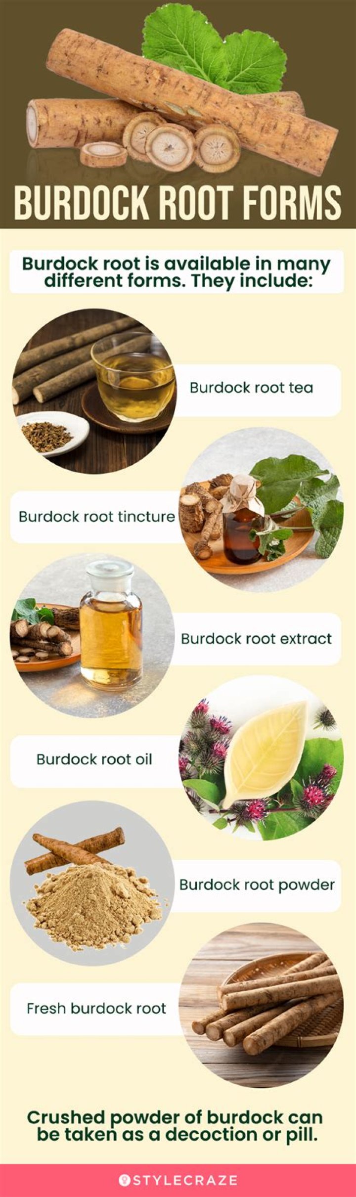 You can often find fresh burdock root at natural food stores and farmers’ markets. If eating it, peel the outer layer. You can eat it raw or cooked, such as sauteed or stir-fried. You can also find it as a dried powder, in supplements, or in some skincare products.