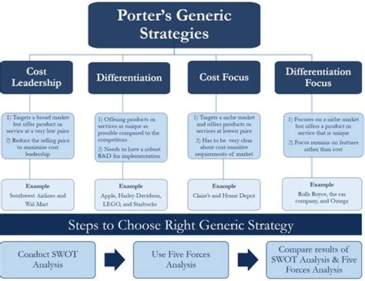 Porter’s generic strategies are cost leadership, differentiation, cost focus, focus differentiation. Porter’s generic strategies describe how a company pursues competitive advantage across its chosen market scope. There are three/four generic strategies, either lower cost, differentiated, or focus.