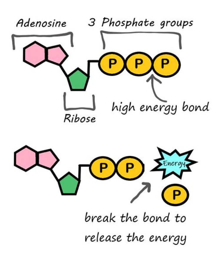 Adenine, Ribose, and three Phosphate groups.When would a 3rd phosphate be removed from ATP?
