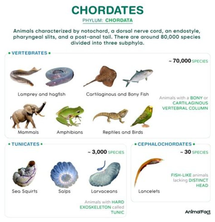 Chordata contains five classes of animals: fish, amphibians, reptiles, birds, and mammals; these classes are separated by whether or not they can regulate their body temperature, the manner by which they consume oxygen, and their method of reproduction.