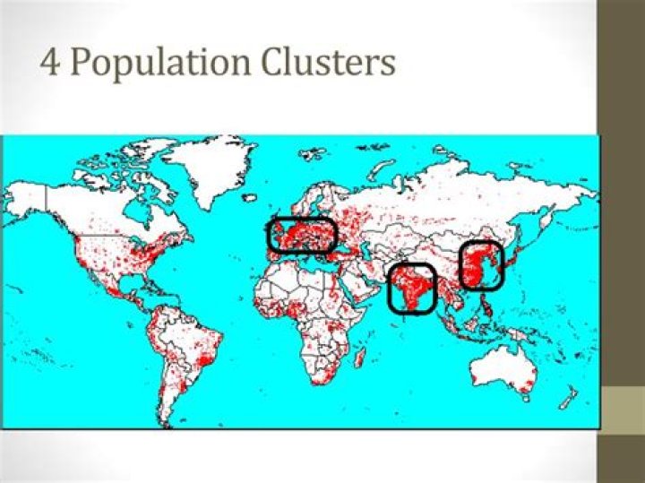 What 5 regions of the world is most of the world’s population clustered in? Major population clusters: Europe, East Asia, Southeast Asia, and South Asia.