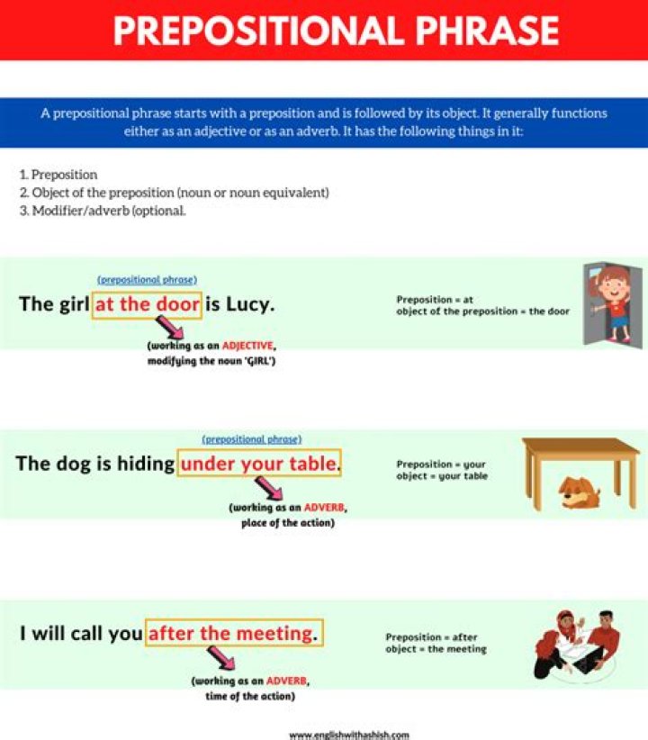 Common prepositional phrase examples include about, after, at, before, behind, by, during, for, from, in, of, over, past, to, under, up, and with.