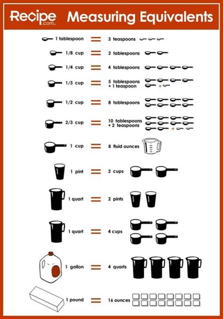 Volume Equivalents (liquid)*8 tablespoons1/2 cup4 fluid ounces12 tablespoons3/4 cup6 fluid ounces16 tablespoons1 cup8 fluid ounces2 cups1 pint16 fluid ouncesWhat are the 4 dry measuring cups?