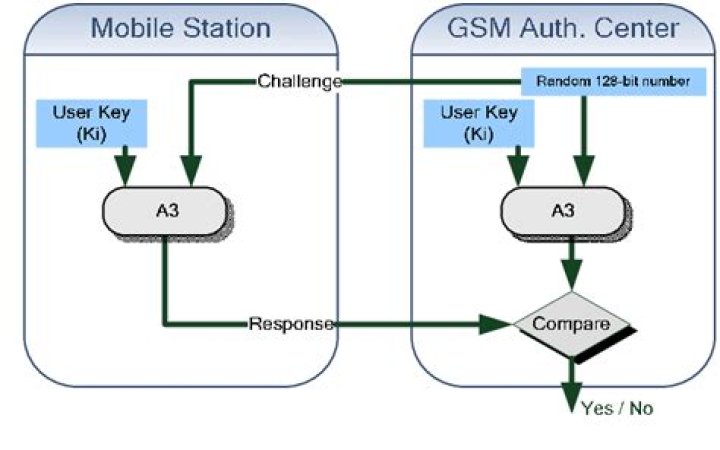 Authentication in the GSM system is achieved by the Base Station sending out a challenge to the mobile station. The MS uses a key stored on its SIM to send back a response that is then verified. This only authenticates the MS, not the user. Figure 15: process of authentication in GSM.