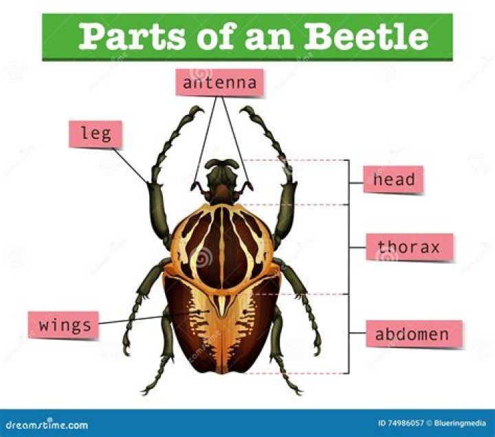 Beetle body parts. The body of the beetle consists of three main segments: head, thorax, and abdomen.