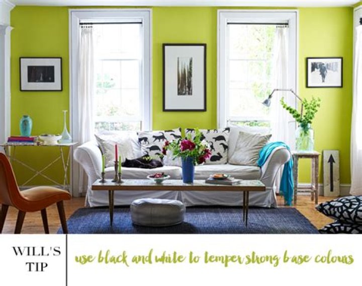 Create an eclectic mixture of new and old furnishings to accentuate your lime green walls. Hues of red, blue, yellow, white and brown supply a colorful decorating palette for your eclectic look. Furnish your living room with a modern off-white sofa with comfortable, plump cushions.