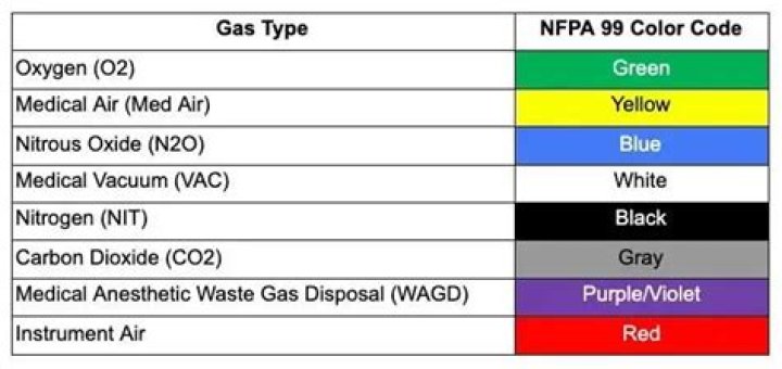 US and ISO gas color codesUSAISOOxygenGreenWhiteNitrous oxideLight blueLight blueMedical airYellowBlack and white