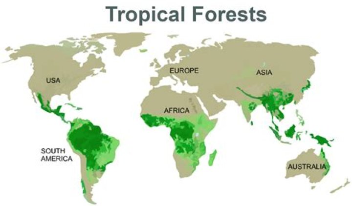 Tropical rainforests are found in Central and South America, western and central Africa, western India, Southeast Asia, the island of New Guinea, and Australia.