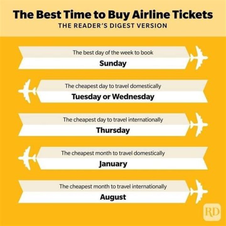 The best day of the week to buy tickets, per Expedia, is Sunday because travelers could save up to 36% compared with booking on other days. Airfares purchased on Saturdays can also be up to 20% cheaper. The most expensive average ticket prices are usually on Thursdays and Fridays.