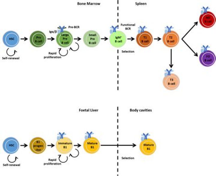 The B lymphocyte lineage of cells is responsible for antibody production. Most of us assume that B lymphocytes, or B cells, got their name because they mature in the bone marrow: “B” for bone marrow. … The “B” in B cells comes from the Bursa of Fabricius in birds.