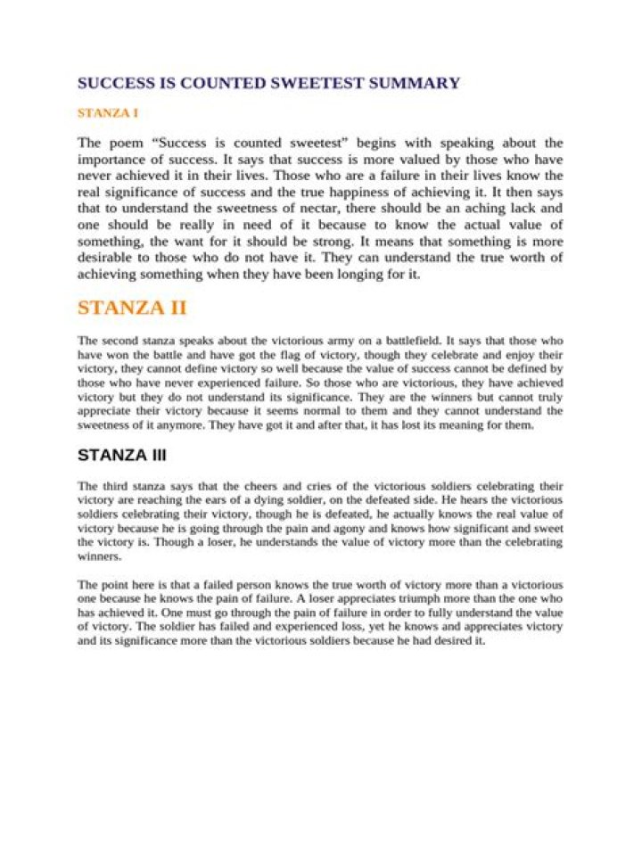 By those who ne’er succeed. To comprehend a nectar. Requires sorest need. The scene is set in this first stanza to dive into the core elements of ‘Success is counted sweetest’—that, basically, you must fail to have something in order to truly understand its worth.