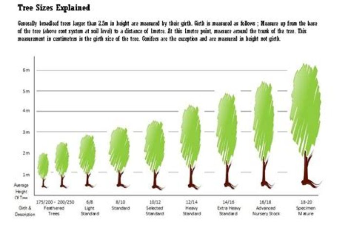 Tree SizeGirth 1 metre above the groundApprox. HeightLight Standard6-8cm2.50-3.00mRegular Standard8-10cm2.50-3.00mSelected Standard10-12cm3.00-3.50mHeavy Standard12-14cm3.00-3.50m