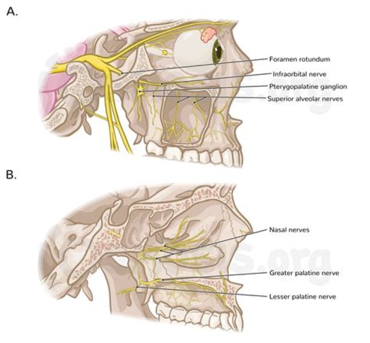 Alveolar nerves (anterior, middle, and posterior superior alveolar nerves)—provides sensory innervation to all of the upper teeth in the maxilla, as well as the gingiva.