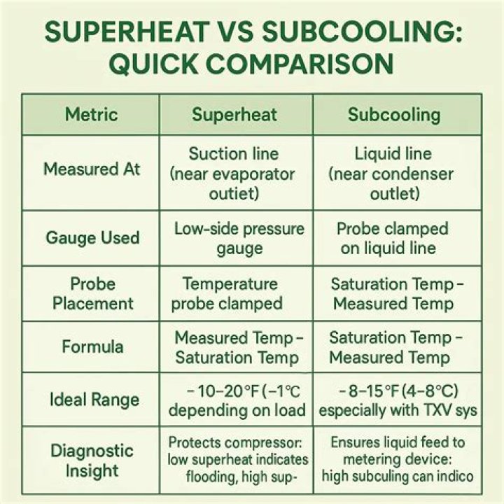 Most heating and cooling systems should operate at a superheat of 10F at the evaporator and between 20F to 25F at the compressor. if your HVAC system has a thermostatic expansion valve (TXV), the subcooling should be between 10F and 18F.