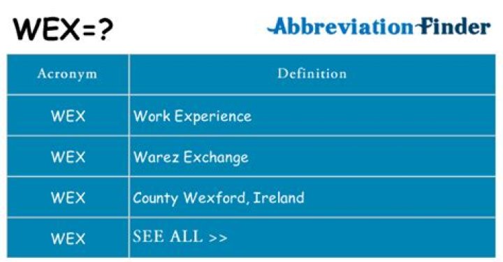 AcronymDefinitionWEXWork ExperienceWEXWarez ExchangeWEXWright Express, Inc.WEXCounty Wexford, Ireland