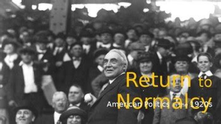 “return to normalcy” In the 1920 presidential election, Republican nominee Warren G. Harding campaigned on the promise of a “return to normalcy,” which would mean a return to conservative values and a turning away from President Wilson’s internationalism.