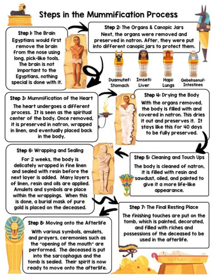 The first step in the Egyptian mummification process was washing the body with water from the Nile River, which was sacred because it helped their crops grow. The next step was removing the brain, using a brain hook. They discarded the brain. Next, the priests would remove other internal organs.