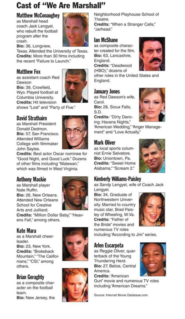 Matthew McConaughey stars as head coach Jack Lengyel, with Matthew Fox as assistant coach William “Red” Dawson, David Strathairn as university president Donald Dedmon, and Robert Patrick as ill-fated Marshall head coach Rick Tolley.