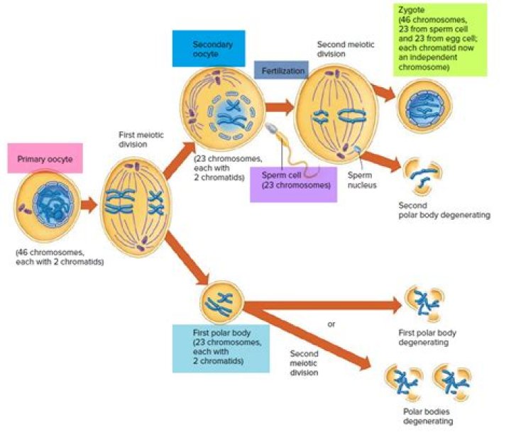 In oogenesis, diploid oogonium go through mitosis until one develops into a primary oocyte, which will begin the first meiotic division, but then arrest; it will finish this division as it develops in the follicle, giving rise to a haploid secondary oocyte and a smaller polar body.