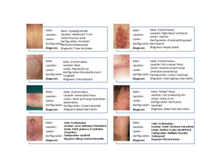 They tend to be divided into three types of groups: Skin lesions formed by fluid within the skin layers, such as vesicles or pustules. Skin lesions that are solid, palpable masses, such as nodules or tumors. Flat, non-palpable skin lesions like patches and macules.