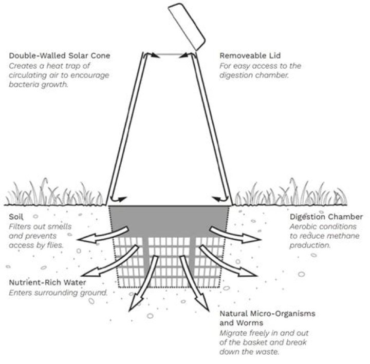The Green Cone is an in-ground digester that breaks down food scraps – including meat, fish, dairy, and bones. They can be placed in yards and gardens, even right next to the house, and don’t require turning or special material combinations to work.