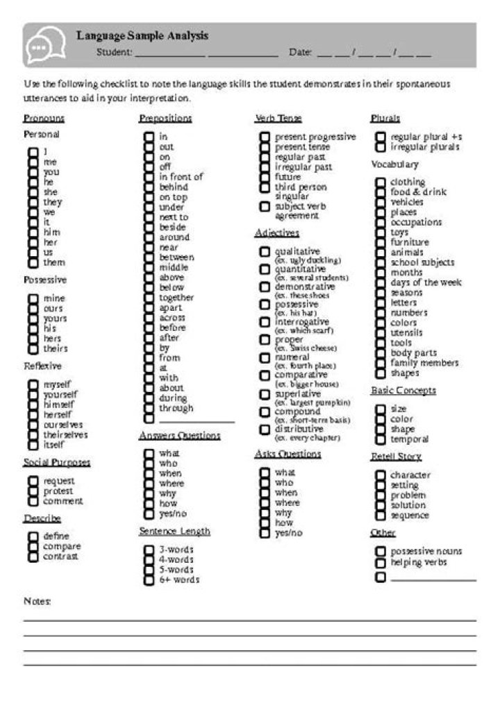 A language sample provides a great deal of information on a child’s language abilities and overall conversational skills. Specific language areas include syntax (grammar), semantics (word meanings), morphology (word parts, such as suffixes and prefixes), and pragmatics (social skills).