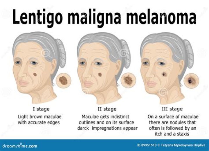 Lentigo maligna may appear as a long- standing discoloured patch of skin, most commonly on the face, which slowly enlarges and develops darker areas with in it. Most in situ melanomas do not cause any symptoms, but tingling or itching may occur.