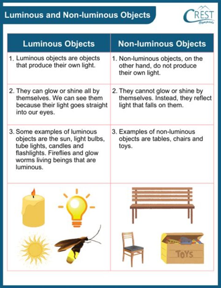 luminous objects: Glowworm, stars, sun, fireflies, electric bulb, tube light, the flame in a lamp, burning candle, a lighted torch, red hot iron rod.