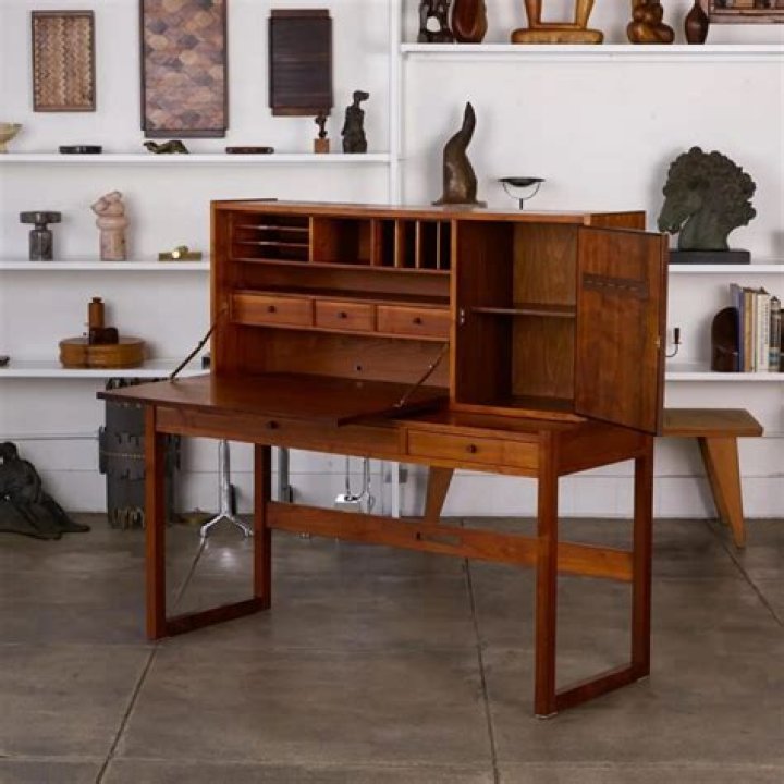 The classic design features drawers built into a wide base, and a hinged desktop which folds down for use and then folds back up to cover more drawers, storage nooks or shelves. … With most antique secretary desks, supports must first be pulled out to hold the desk top before it is lowered.