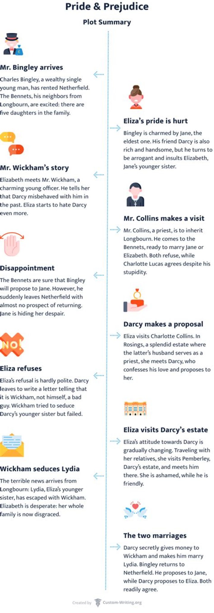 The plot of Pride and Prejudice follows a linear, chronological structure. Elizabeth Bennet is the protagonist, and the major conflict revolves around her struggle to find a compatible husband despite the obstacles presented by both social conventions and her own lack of self-awareness.