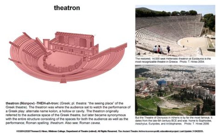 Theatre comes from the Ancient Greek theatron, which means a place for showing, or performing.