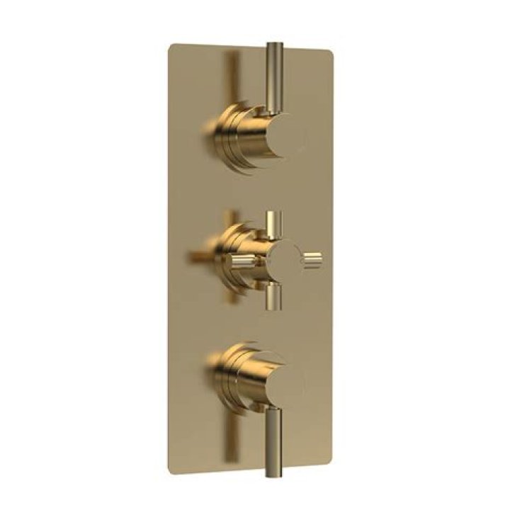 Product Description. This triple vertical shower valve enables you to control the temperature and water pressure for two separate outlets in your shower. It includes one control for temperature and two for water pressure. Its thermostatic design prevents it from becoming too hot.