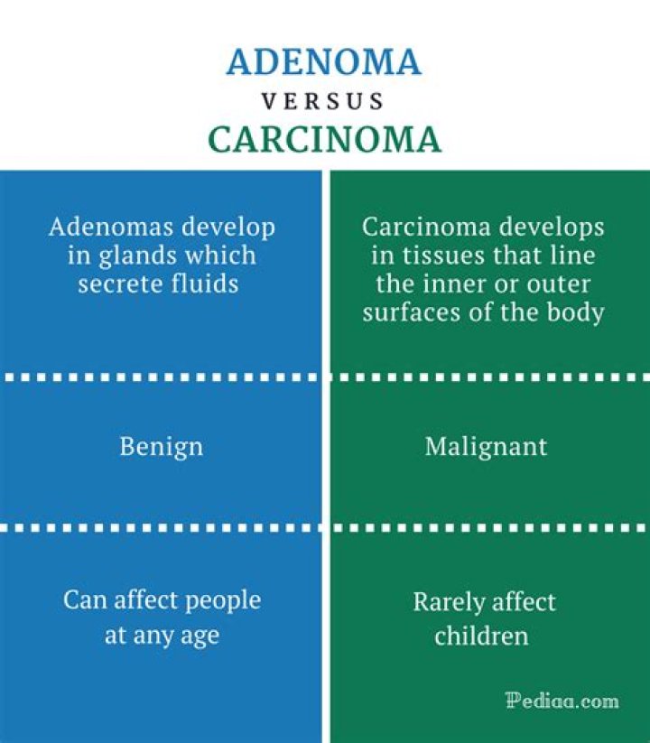 An adenoma is a benign (noncancerous) tumor. Adenomas start in the epithelial tissue, the tissue that covers your organs and glands. These tumors grow slowly and look like small mushrooms with a stalk.How common is adenoma?