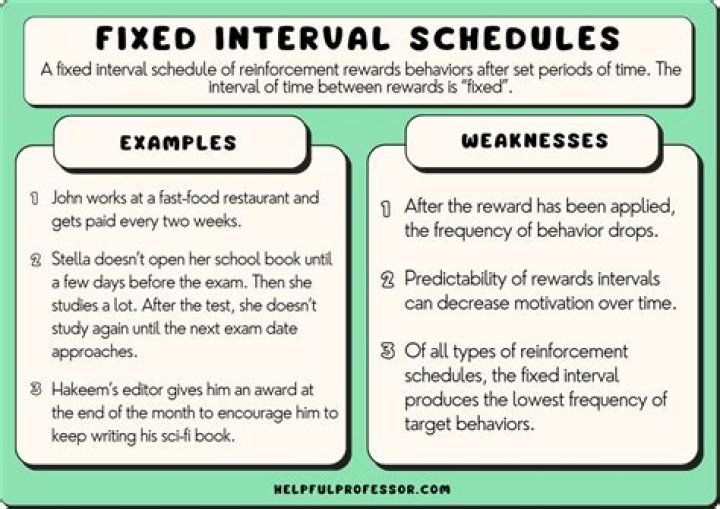 A weekly paycheck is a good example of a fixed-interval schedule. The employee receives reinforcement every seven days, which may result in a higher response rate as payday approaches. Dental exams also take place on a fixed-interval schedule.