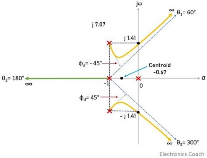 Asymptotes of Root Loci : Asymptote originates from the center of gravity or centroid and goes to infinity at definite some angle. Asymptotes provide direction to the root locus when they depart break away points.