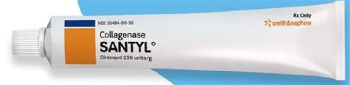 Collagenase Santyl® Ointment is a sterile enzymatic debriding ointment which contains 250 collagenase units per gram of white petrolatum USP. The enzyme collagenase is derived from the fermentation by Clostridium histolyticum. It possesses the unique ability to digest collagen in necrotic tissue.
