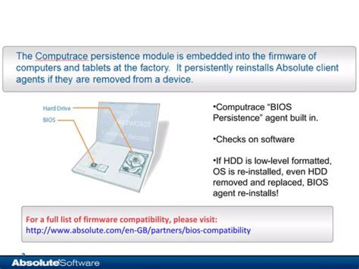 Computrace Lojack for Laptops is an anti-theft security package that can be embedded into a computer’s basic input/output system (BIOS) and installed onto the hard drive of the computer system.
