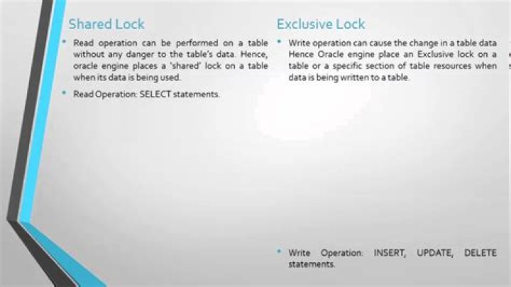 Shared Lock. S ( S hared) Several users (transactions) can access locked data at the same time in display mode. Requests from further shared locks are accepted, even if they are from different users. An exclusive lock (E) set by another user on an object that already has a shared lock will be rejected.What is exclusive lock in Postgres?