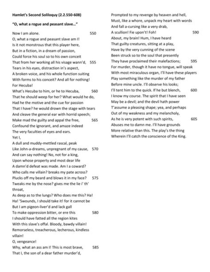Hamlet’s soliloquy comes in act 2 scene 2 of Hamlet, shortly after he has spoken with the players or actors, and just before he hatches his fiendish plan to try to determine the guilt of his uncle (which he comes up with towards the end of the soliloquy).