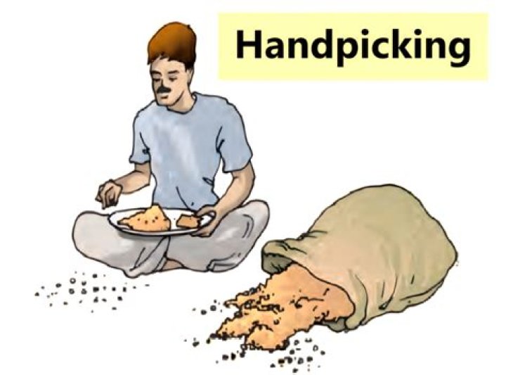 Hand-picking is a method of separation by which impurities that are different from the useful material in a mixture are hand-picked and removed. For example, rice, wheat, pulses, etc., contain impurities such as small stones or unwanted grains.