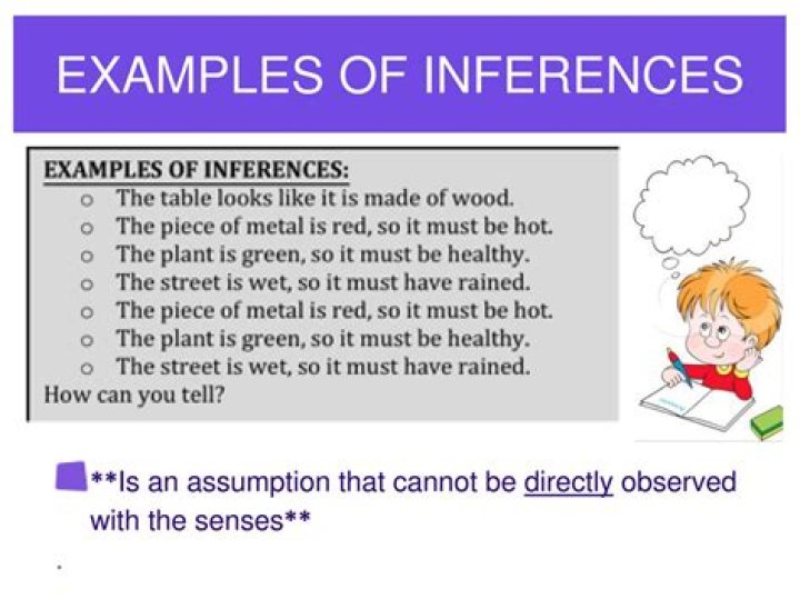 When we make an inference, we draw a conclusion based on the evidence that we have available. … Examples of Inference: A character has a diaper in her hand, spit-up on her shirt, and a bottle warming on the counter. You can infer that this character is a mother.