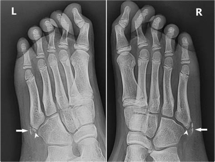Apophysis of the fifth metatarsal base appears on radiographs at age 10 for girls, and age 12 for boys. Fusion of the apophysis and the fifth metatarsal base usually takes place within the following 2–4 years.