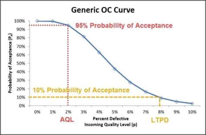 The Operating Characteristic (OC) curve describes the probability of accepting a Lot as a function of the Lots quality (where a Lot is a batch or section of continuous work). As the proportion defective increases, the probability of acceptance of the lot in question decreases.