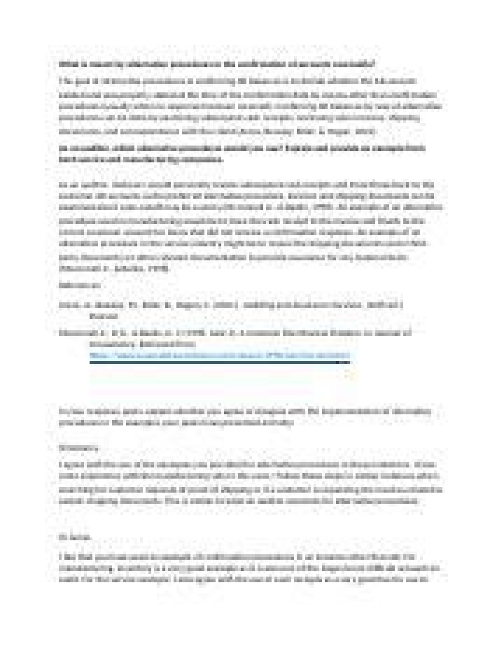 In the examination of accounts receivable, for ex- ample, alternative procedures may include examination of subsequent cash receipts (including matching such receipts with the actual items being paid), shipping documents, or other client documentation to provide evidence for the existence assertion.