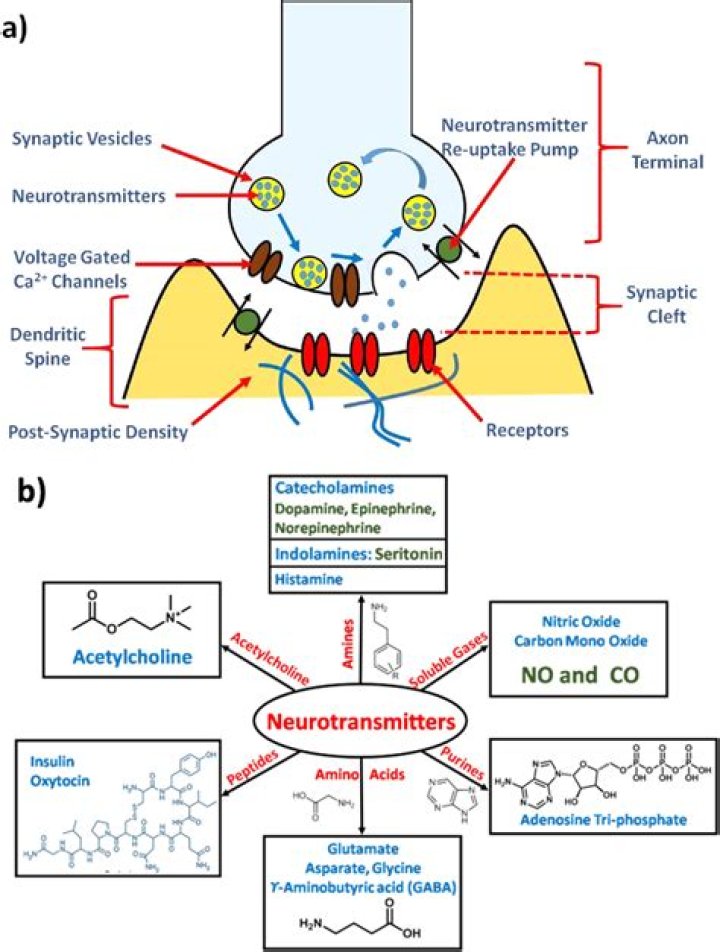 In response to a threshold action potential or graded electrical potential, a neurotransmitter is released at the presynaptic terminal. The released neurotransmitter may then move across the synapse to be detected by and bind with receptors in the postsynaptic neuron.