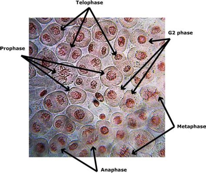 An onion root tip is a rapidly growing part of the onion and thus many cells will be in different stages of mitosis. The onion root tips can be prepared and squashed in a way that allows them to be flattened on a microscopic slide, so that the chromosomes of individual cells can be observed easily.